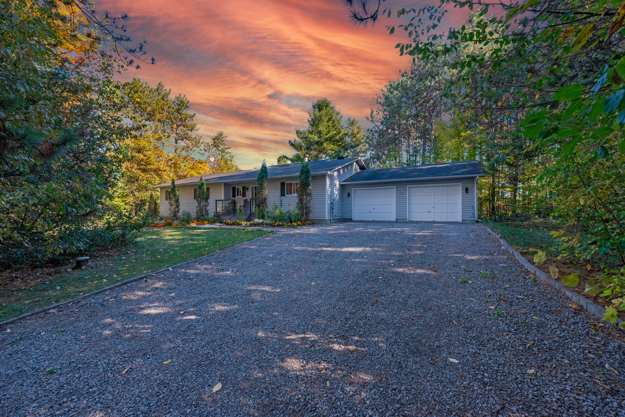 Welcome to 117 Plantation Drive in Woodlawn, a beautifully maintained 3-bedroom, 2-bathroom bungalow set on just under 3 acres of tranquil land. Surrounded by mature trees, this property offers exceptional privacy and a serene setting while still being part of a growing family-oriented neighborhood. Step inside to discover a bright open-concept living room anchored by a stunning four-sided glass fireplace, the true heart of the home and a perfect gathering space for family and friends. The home has been lovingly cared for by the same owner for over 30 years, with numerous updates throughout that blend comfort, function, and pride of ownership. An efficient geothermal system provides both heating and cooling, paired with a private well and septic system, meaning the only utility cost is hydro .Outdoors, you'll find a wrap-around composite deck with sleek glass railings, offering an ideal space to relax and take in the peaceful surroundings. The property is beautifully landscaped with a welcoming front garden, open spaces to explore, and wooded areas that provide both beauty and privacy. An oversized 2-car garage adds even more value, perfect for a workshop, hobby space, or additional storage. The location is hard to beat, school buses service the area, and the highly regarded Stonecrest Elementary School is just 2 minutes away, making it perfect for young families. This is a community where residents enjoy the best of both worlds, the space and freedom of country living with the support of a welcoming neighborhood. With its acreage, standout features, and unbeatable location, this property offers a rare opportunity to enjoy a private retreat while being close to schools, amenities, and the vibrant growth of the Woodlawn area.